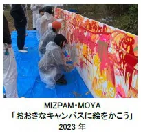 青空のもとで講師がこどもたちと一緒に大きなキャンバスに絵を描くワークショップです。完成した作品を会場に展示します。
