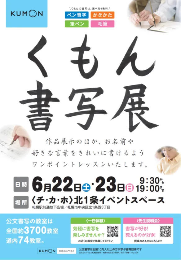 くもん書写展、札幌駅前通「チ・カ・ホ」で6月22日・23日開催 全国の最優秀作品120点が集結!~入場無料~