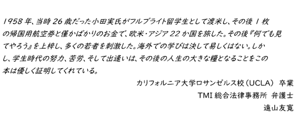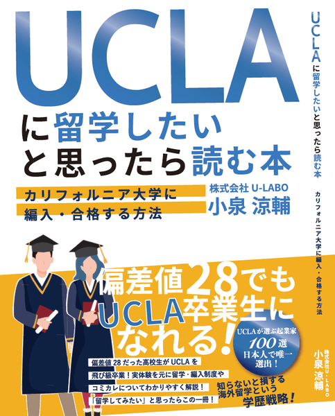 本書では、偏差値28の高校生がカリフォルニア州のコミュニティーカレッジ(コミカレ)に入学し、その後カリフォルニア大学ロサンゼルス校(UCLA)に編入学、そして飛び級で卒業した小泉自身の留学経験をはじめ、U-LABO設立に至るまでの想い、米国編入制度の仕組みと対策などについて紹介しています。世界名門大学への留学を考えている方にはぜひ一読していただきたい一冊です。