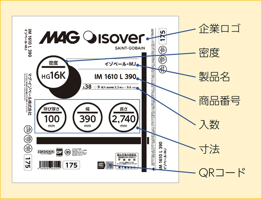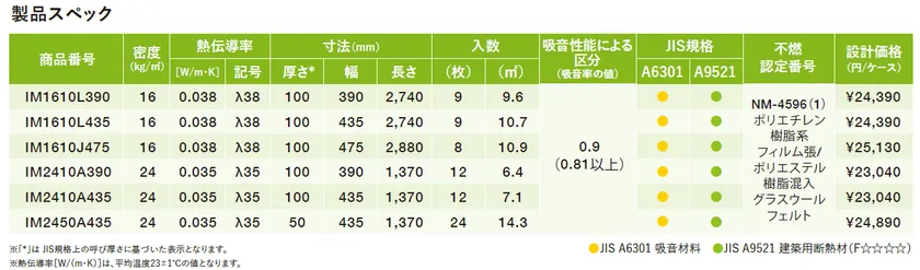 仕様 :密度高性能16kg/m3、高性能24kg/m3