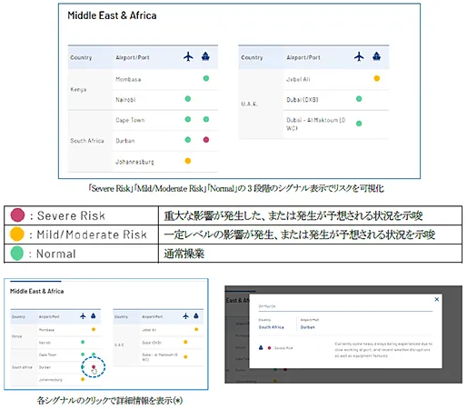 G-APOSでは、何らかの物流リスクを抱える地域が世界地図上で一目で確認でき、ページ下部では各国の空港・港湾ごとに「Normal」、「Mild/Moderate Risk」、「Severe Risk」の3段階のシグナルを色分け表示し、リスクを可視化しています。さらに、各シグナルをクリックすると、現地の詳細情報が表示されます(*)。世界中に広がる当社の現地法人および代理店の情報網を活用して情報をタイムリーに集約し、毎日(毎営業日)更新していきます。