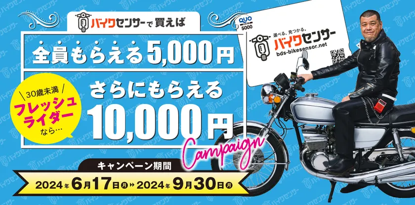 株式会社ビーディーエス(所在地:千葉県柏市、代表者:徳山 勇秀)が運営するバイク&パーツ検索サイト「BDSバイクセンサー」では、2024年6月17日(月)~2024年9月30日(月)の期間限定で、「全員もらえる5千円、フレッシュライダーならさらにもらえる1万円キャンペーン」を開催します。