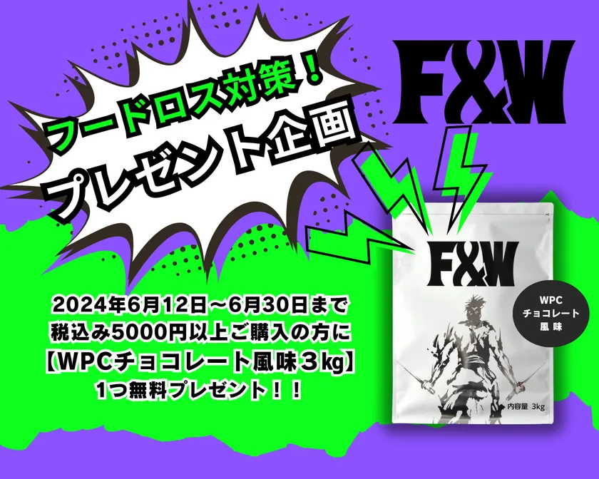フードロス対策キャンペーンとしまして、F&Wの公式サイトでご購入金額が税込5,000円以上の場合、濃縮ホエイプロテインWPCチョコレート風味3kgが1つ無料となります。