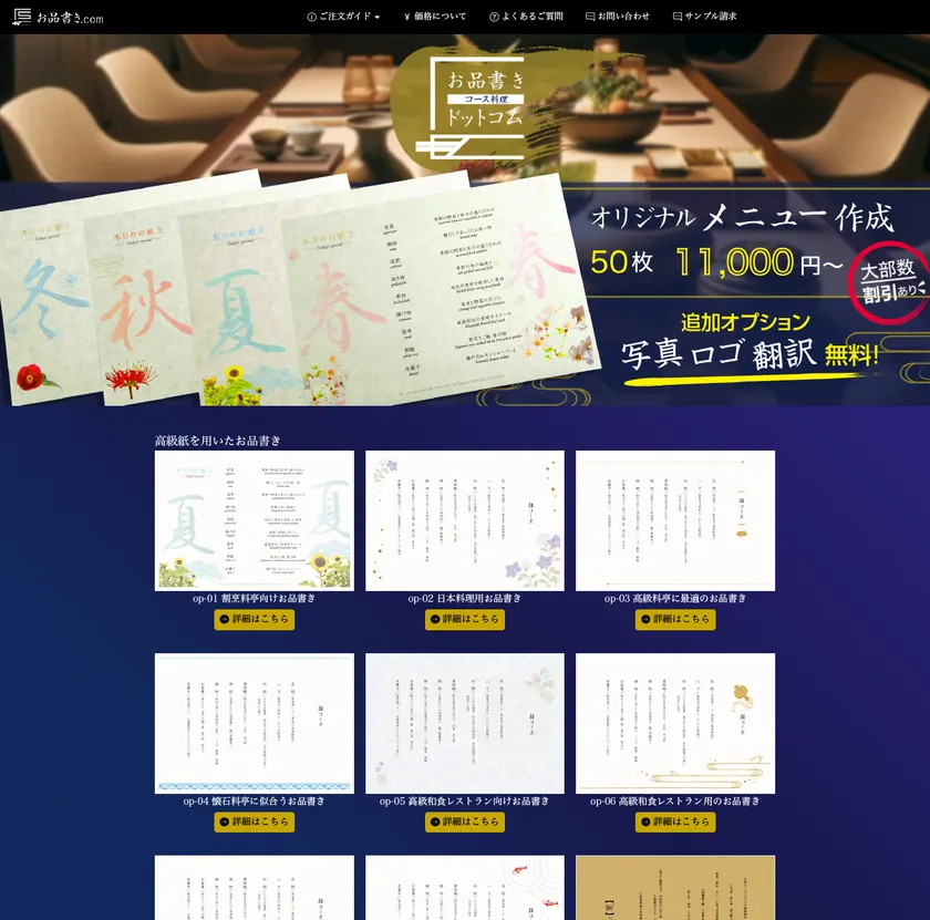 今回、飲食店にて料理の配膳前にお出しするお品書きの半オーダーメイドサイトとしてオープンいたしました。