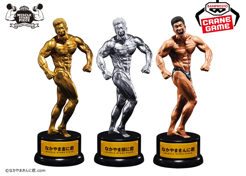 「誰に贈るんだい!?」をコンセプトに、『MUSCLE STARS PIECE なかやまきんに君~りそうの姿~』が「きんにくトロフィー」になって登場。日々トレーニングを頑張る自分へのご褒美にしたり、運動会や各種イベントのトロフィーとして贈呈したり、はたまたいつもお仕事を頑張ってくれるお父さん・お母さんへの感謝の気持ちとして、なかやまきんに君がもつ「パワー」を贈ることができます。