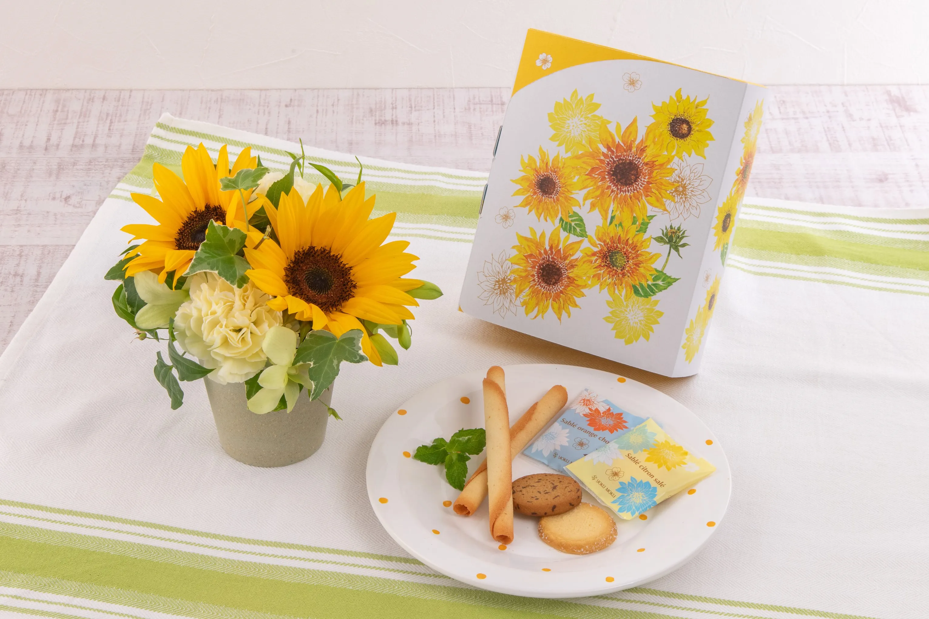 想いがたくさん詰まった夏限定パッケージの「カドー ドゥ レテ」(3種18個入)を、元気をもらえる夏の旬花のひまわりと爽やかなグリーンをあしらった、日比谷花壇のアレンジメントとともにお届けします。