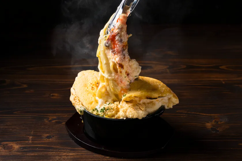 スフレ溶岩パスタ 博多めんたいカルボナーラ