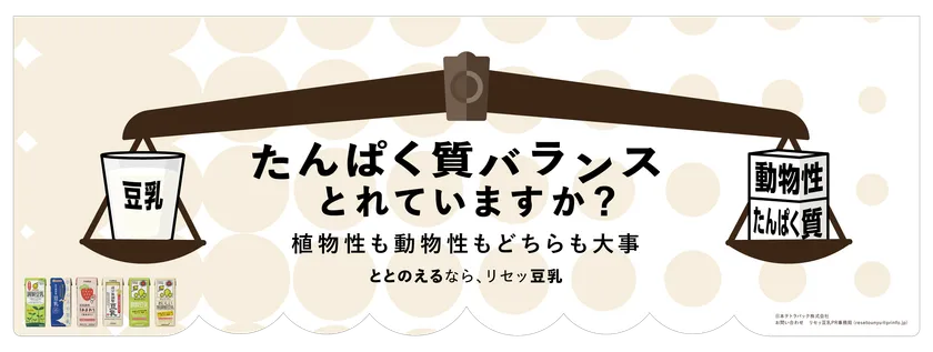 豆乳などの紙パックを製造している日本テトラパック株式会社(以下、日本テトラパック)が推進する「リセッ豆乳プロジェクト」は、たんぱく質を摂る上で動物性と植物性のバランスも意識し、豆乳をプラスしてたんぱく質バランスをととのえてもらうべく、そのメリットを発信しています。その一環として、たんぱく質バランスを意識してもらうために揺れ動く天秤で課題喚起する交通広告を2024年6月16日から6月29日までの期間で小田急線・東急東横線・東急田園都市線・新宿駅メトロプロムナードにて展開しています。新宿駅メトロプロムナードでの動く展示展開は初となります。