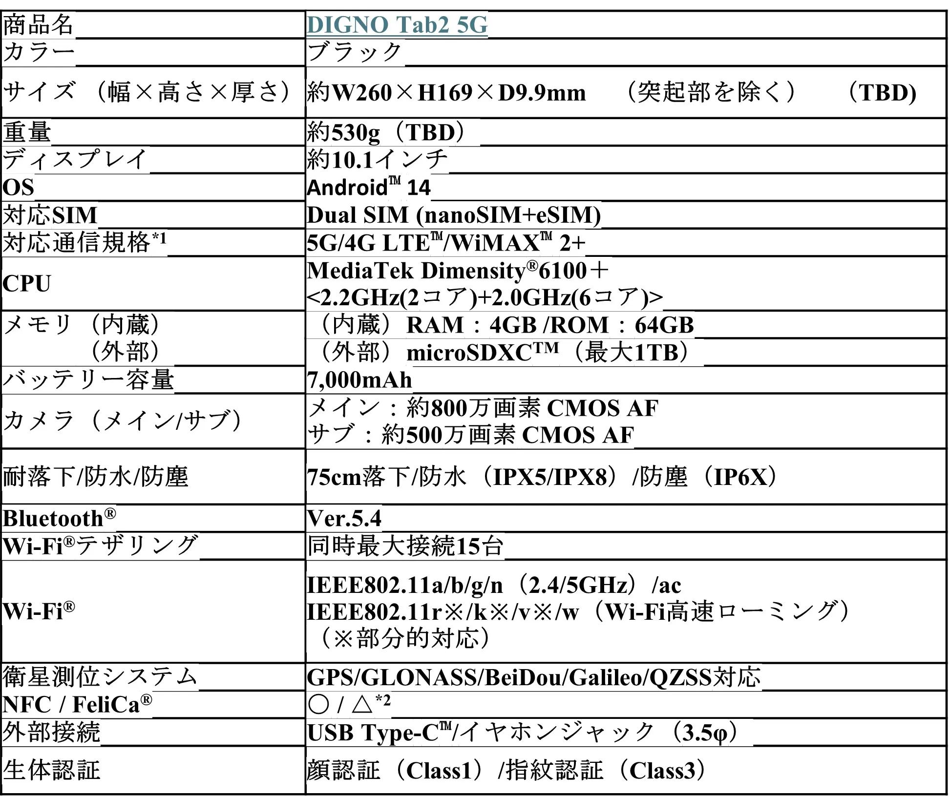 ・発売されたタイミングから起算して最大2回、最新OSへのバージョンアップが適用されます。OSバージョンアップの適用回数は、購入時期によって変わります。また、最新OSとは「DIGNO(R) Tab2 5G」に搭載されているAndroid OSに対して、OSバージョンアップが可能な時期において適用されるAndroid OSの最新版を指します。OSバージョンアップの適用回数は販売開始時点の予定であり、変更となる可能性があります。