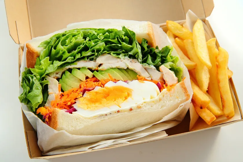 グリンリーフや人参ラペ、紫キャベツなどの数種類の野菜に、自家製のローストビーフやチキンを積み上げたサンドイッチ。断面はカラフルで綺麗なだけでなく、たくさんの具材でボリューム満点に仕上げており、見た目も量も満足いただけるよう作り上げました。