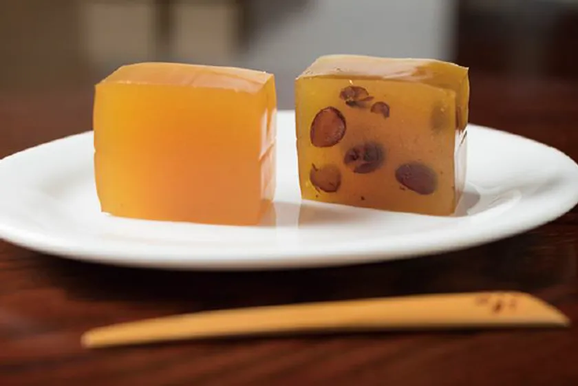 色鮮やかな琥珀色のいも羊羹。道南産大粒小豆「大納言」入り。