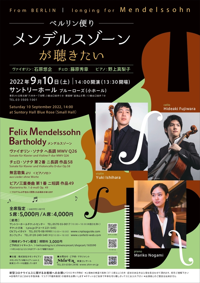 ベルリンで学び、国内外で活躍する3人が奏でる 『~ベルリン便り~メンデルスゾーンが聴きたい』がサントリーホールで開催決定 カンフェティにてチケット発売!