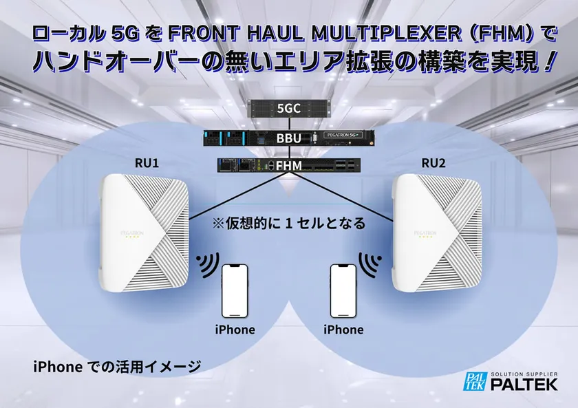 この動態展示デモでは、次世代無線インフラソリューションとして、O-RAN準拠のPegatron(PEGATRON Corporation)社製ローカル5G基地局を活用します。1台のBBU(Baseband Unit:CU/DU機能を持つ)に2台のRU(Radio Unit)を接続する際、FHM(Front Haul Multiplexer)をFront Haulに組み込む予定です。FHMを組み込むことで、本来複数のRUのために複数のセルを構成する必要があるところを、仮想的な1つのセルとして構成することが可能になります。その結果、ハンドオーバーを伴わないローカル5Gネットワークのエリア拡張を構築できます。