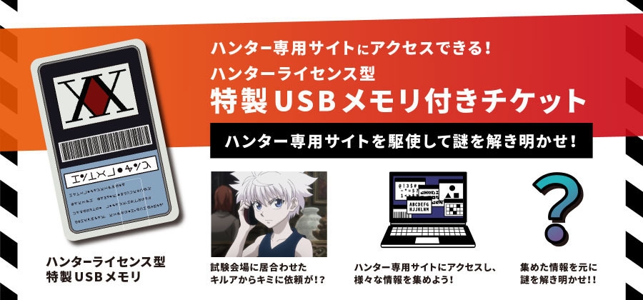 本イベント限定のオリジナルストーリーの「謎」が入っている「ハンターライセンス型 特製USBメモリ」では、キルアからの依頼を受けハンター専用サイトにアクセスするなど、より一層「HUNTER×HUNTER」の世界をお楽しみいただけます。