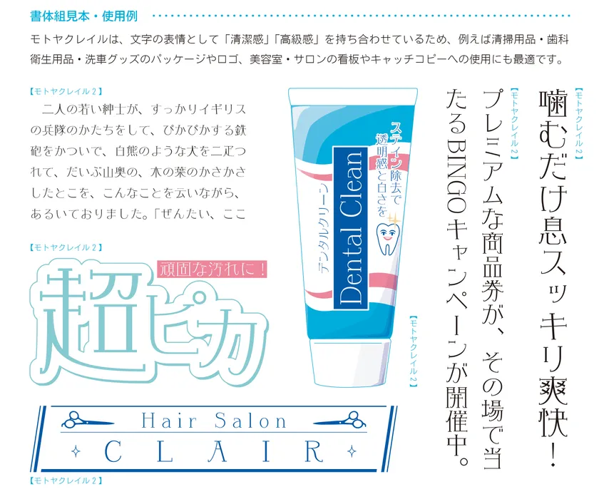 「モトヤクレイル」は、文字の表情として「清潔感」「高級感」を持ち合わせているため、例えば清掃用品・歯科衛生用品・洗車グッズのパッケージやロゴ、美容室・サロンの看板やキャッチコピーへの使用にも最適です。