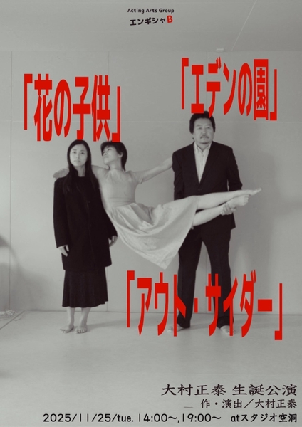 今回の大村正泰生誕公演では、芸術監督/大村正泰が初期に描いた短編戯曲を、5年間活動を共にしてきた中村・宮谷と共に演じます。「花の子供」はエロス、「エデンの園」は純愛、「アウト・サイダー」は友愛をテーマに、大人の寓話をお届けします。命や生き方そのものに訴えかける、大村独自の戯曲や大野舞踏表現を取り入れた演技・身体性は、エンギシャBでしか味わえません。生の舞台で体感してみて下さい。