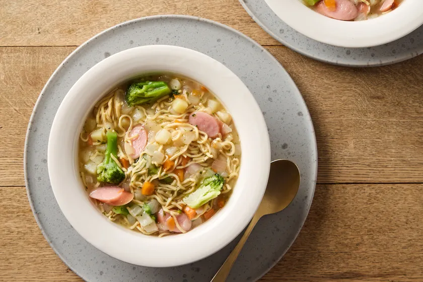 ソーセージ、ブロッコリー、じゃがいも、たまねぎ、にんじんと具材がたっぷり。