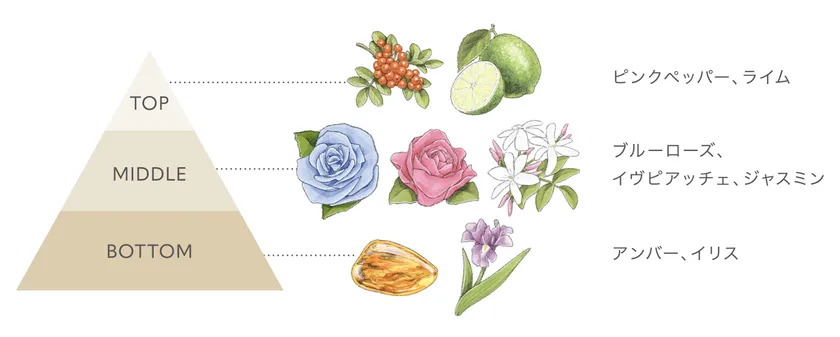 香り立つブルーローズを基調に、爽やかで澄み渡るピンクペッパーとライムをアクセントにした華やかで清々しいドレッシーブーケの香り。