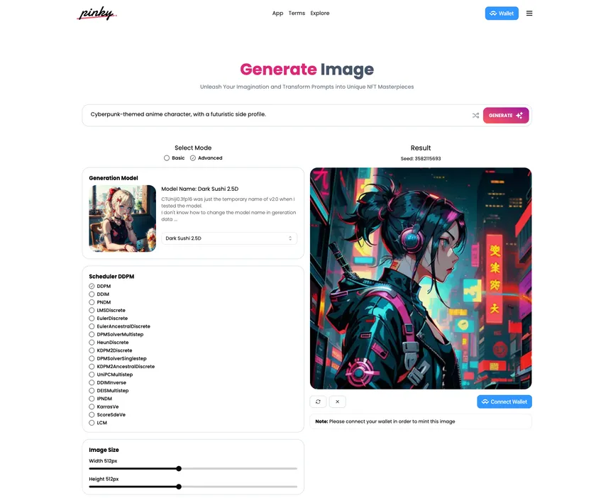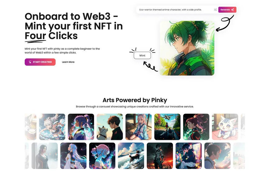 PINKYは、GAI技術を活用したプラットフォームで、ユーザーが生成したアート作品をNFTとしてブロックチェーンに記録することができます。数クリックでAIが生成したデータをNFT化し、OpenSeaなどで公開・取引することが可能です。
