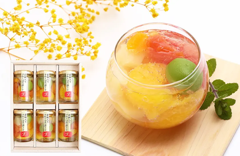 「若桃」「みかん」を始め、「甘夏」、「グレープフルーツ」、「パイナップル」の美味しい5種のフルーツを詰め込んだ、果実の宝石箱とも呼ばれるスイーツギフトです。