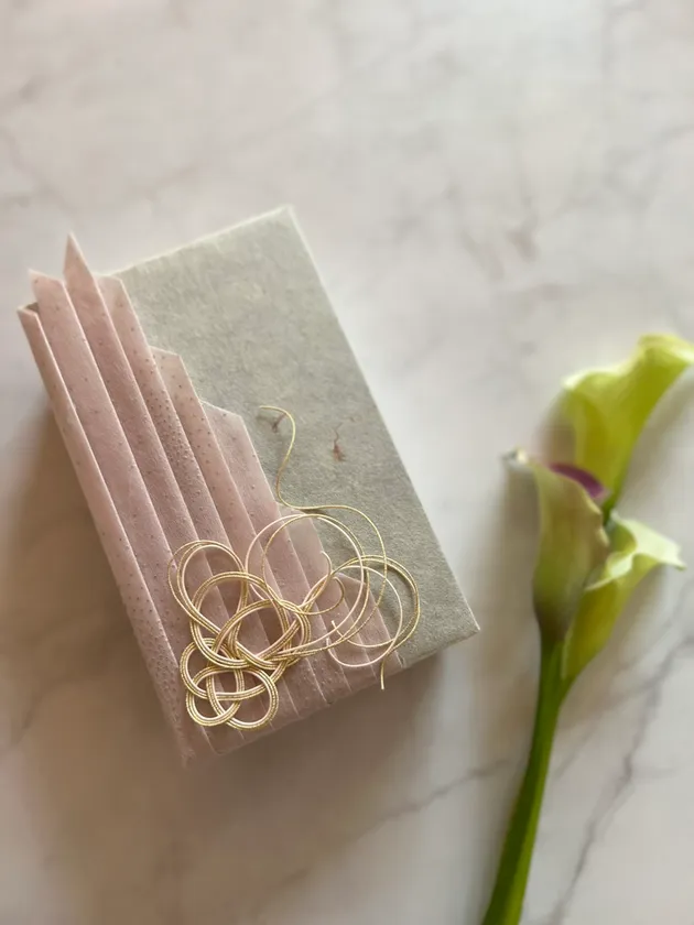 さくらをはじめとする草木で染められた11色の楮が入った小川和紙「草木染雲龍」を使用した ラッピング例