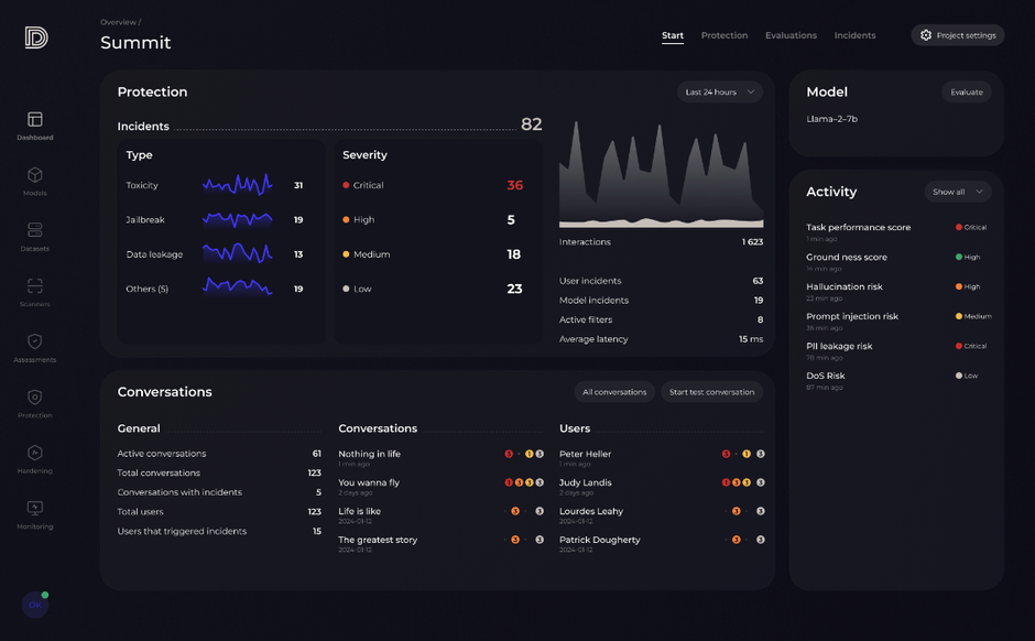 DeepKeepは機械学習パイプラインを保護することで、安全、公平、正確、説明可能で信頼できるAIセキュリティソリューションを提供しています。これには、リスク評価、予防、検出、監視、緩和におけるビジョン・データ・モデル、LLM、表形式モデルが含まれます。多様なソース・ドメイン、モデル、データセットと無限のコンテンツ生成を保護できるのは、生成型AIで構築されたAIネイティブ・セキュリティだけです。DeepKeepのエンタープライズソフトウェアプラットフォームは、機械学習モデルの研究開発段階から導入、製品ライフサイクル全体にわたってセキュリティと信頼性を提供します。