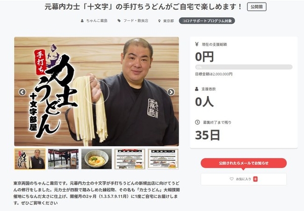 力士うどんプロジェクトは資金集めを目的としたものではなく、元力士の手打ちうどんを1人でも多くの方にお召し上がり頂きたく始めたプロジェクトで顧客集めを目的としています。