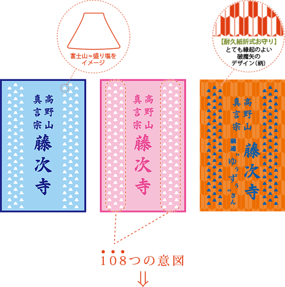 人には108つの煩悩があると考えられてきました。煩悩(ぼんのう)とは人の心を惑わせ、悩ませ、心身の苦しみを生みだす心のはたらきであり、その108つの煩悩を祓うために除夜の鐘をつく回数は108回とされているようです。同様に108つの煩悩を祓えますように!と108つの盛り塩(柄)1つごとに思いを込めることにより、少しでも心が和み健やかにお過ごしいただきたいという思いから、様々な良き意味を持つと言われている、盛り塩(柄)の表示数も108つといたしました。