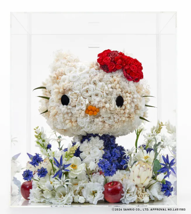 ハローキティの丸みを帯びた愛らしい全身フォルムや赤いリボンは、やわらかな花びらが特徴のバラやカーネーション、アジサイ、カスミソウなどの数種類の花々によって表現し、足元にはクレマチスやプロテアなど、大人の雰囲気と高級感を醸し出す花々を敷き詰めています。