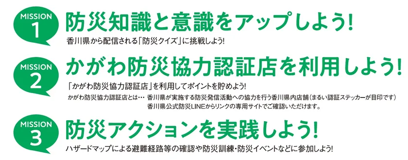内容は、香川県公式防災LINEを友だち登録して、3つのミッションをクリアしてもらえる「防災ポイント」を50ptためる毎に防災備蓄品などがあたる抽選に応募いただけます。
