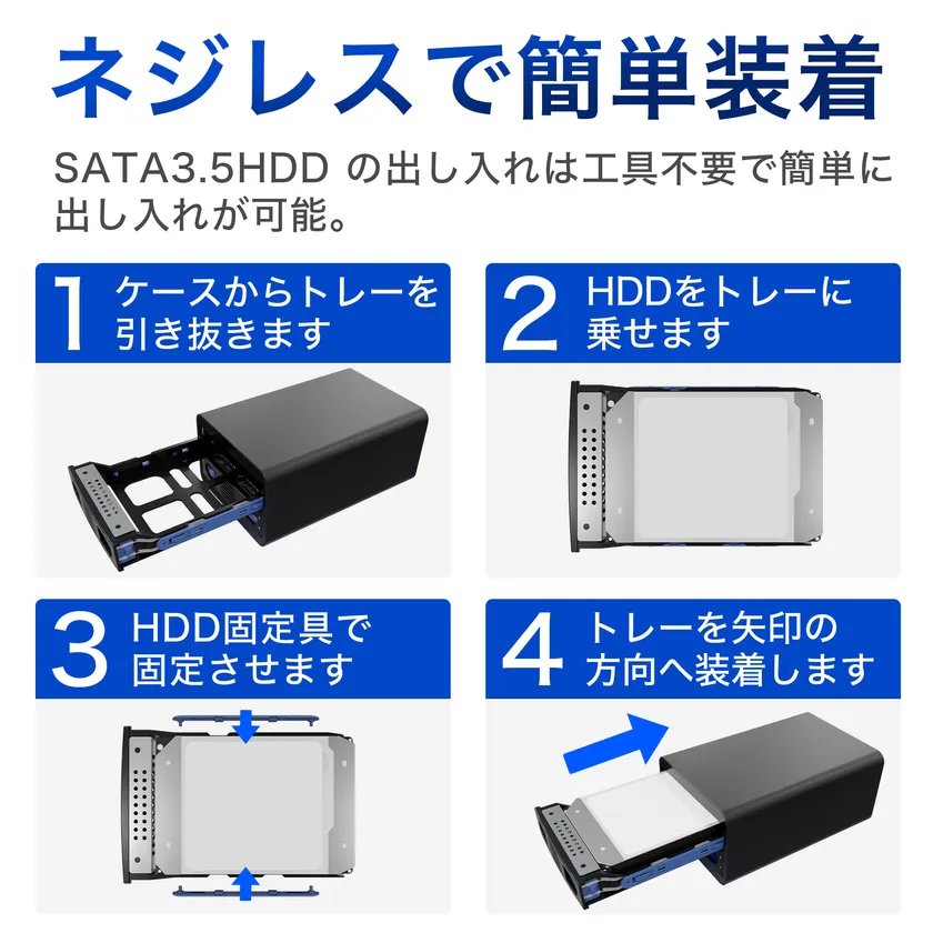 SATA3.5HDDの出し入れは工具不要で簡単に出し入れが可能です。また、HDDの固定も専用のトレーに付属している治具で固定できるため、ネジレスでご利用いただけます。※4