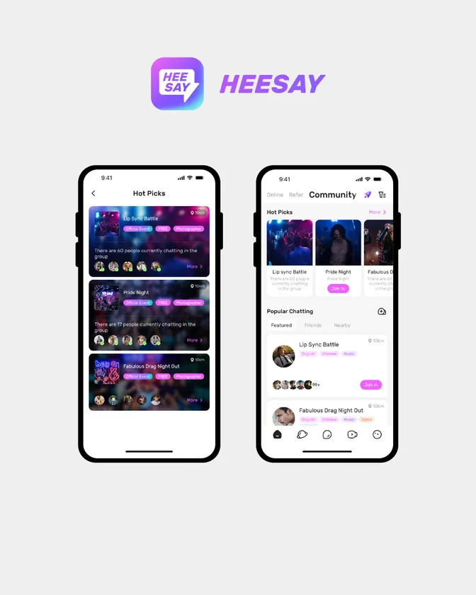 新機能であるCOMMUNITYは、「Hot Picks」と「Group Chat」の2つの主力セクションを中心に展開します。「Hot Picks」セクションでは、ユーザーは、HeeSayが主催または共催する近くのオフラインのイベントを検索、チェック、参加申込まですることができます。新しく追加された「招待」ボタンにより、ユーザーは友達を招待して、オフラインでの様子をシェアできるようになりました。