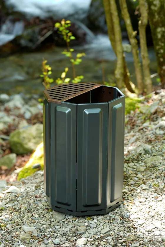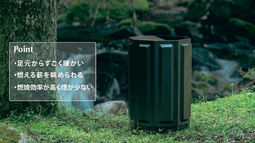 この焚火台は「二次燃焼」と呼ばれる高効率で煙が少ない燃焼が可能となる機能を持ちます。そして従来の二次燃焼式焚火台が抱えていた、使用者が暖まりづらい、燃えている薪が見えない、薪の消費が早い、という課題を8枚の取り外し可能なパネル構造で解決しています。