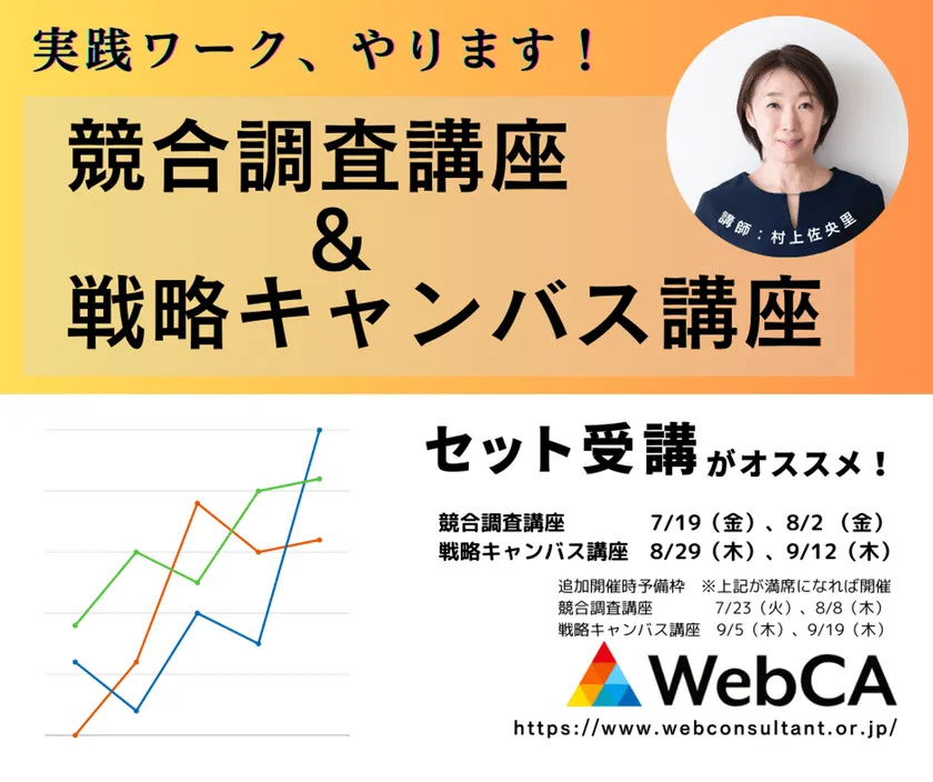 一般社団法人ウェブコンサルタント・ウェブアドバイザー協会(略称:WebCA、代表理事:権 成俊)は、ウェブサイト構築の土台「調査・分析」を学ぶ【競合調査】【戦略キャンバス】講座を7月19日(金)から順次開催します。