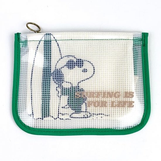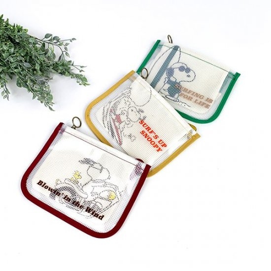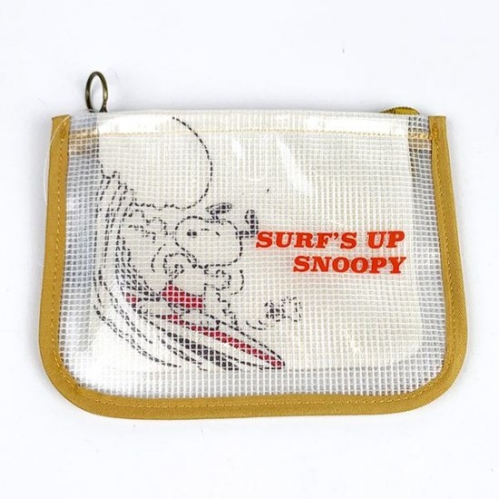 ジョークールスタイルのスヌーピーがサーフボードを持ったデザインの、メッシュポーチです。フラットな形状なので携帯しやすく、縁取りもあってシッカリした作り♪