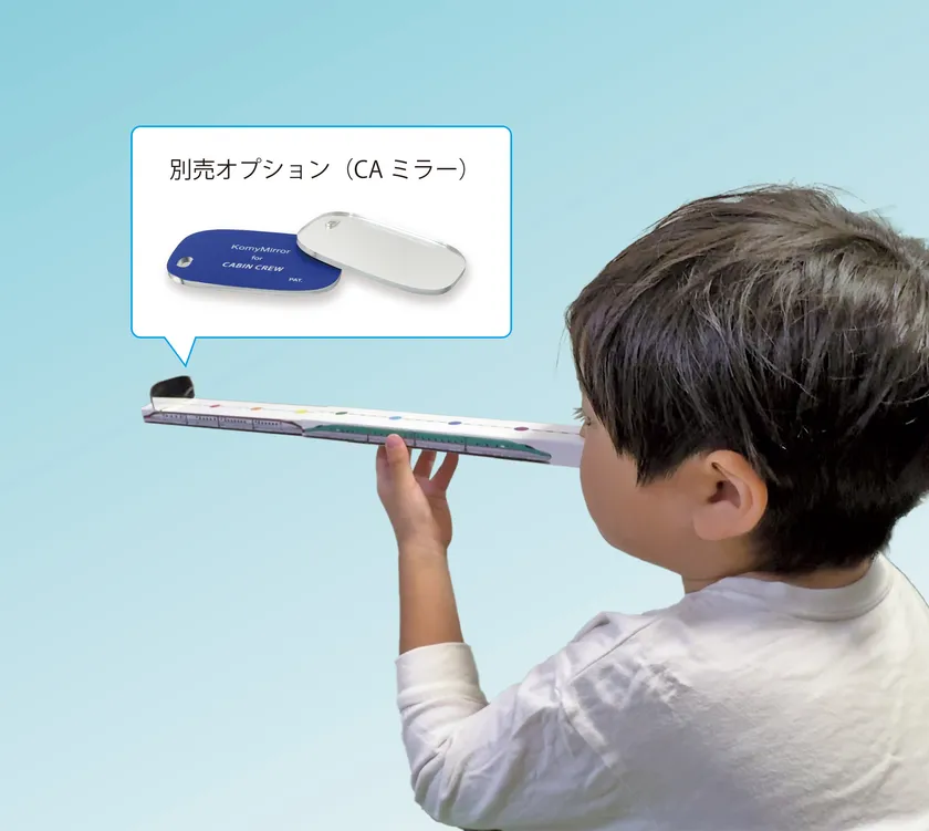 コミーの軽量プラスチックミラー「CAミラー(※別売)」を装着することによって、ストレッチ距離が2倍になり、中間距離から眼球運動のストレッチが行えます。