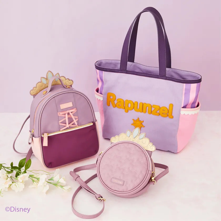 「ラプンツェル」の着ているドレスのリボンディテールをデザインしたリュック。付属のマルチポーチをセットしていただくと、「ラプンツェル」がドレスを着て、ティアラをつけている姿を連想させる世界観溢れるアイテムに。様々なトーンのラベンダーカラーがカジュアルなコーディネートを女性らしい上品なスタイリングにまとめてくれる。シンプルなコーディネートのワンポイントに合わせていただくのもオススメ。