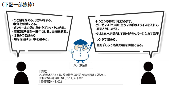 「のど飴をなめる、うがいをする、水分を頻繁にとる。」、「喉を保湿する、喉を温める。」など、のどを労わる行動が多く見受けられた。一方で、「レンコンの搾り汁を飲みます。」、「ガーゼマスクの中に生タマネギのスライスを入れて、寝るときにつける。」など、一見変わった対処をする方がいることもわかった。