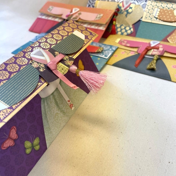 韓国伝統衣装の韓服(チマチョゴリ)が立体的にデザインされたポチ袋! デジタル印刷技法ではなく、一枚ずつ印刷するリーフ技法(金属活版に金色銀色フィルムを入れて圧盤で押して加工される印刷技法)を使用し、付いているリボンや豆粒飾りなどもハンドメイドで作成してクオリティを高めた製品です。