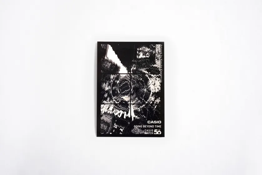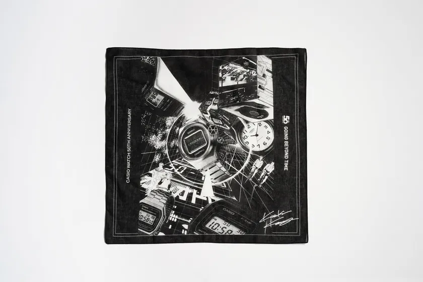 河村氏は、今回のアートワークについて、「50年という時の流れや、新たな時代の1ページを切り開く、というメッセージを込めました」とコメント。河村氏ならではの手法であるコラージュにより、復刻モデル“CASIOTRON”「TRN-50」と“G-SHOCK”初代モデル「DW-5000C」、軽量・薄型のデジタル液晶モデル「F-91W」、3針タイプの「MQ-24」、メタルバンドが特徴的な「A168」が組み込まれ、過去の広告ビジュアルや貴重な資料も随所に散りばめられたアートワークに仕上がっています。