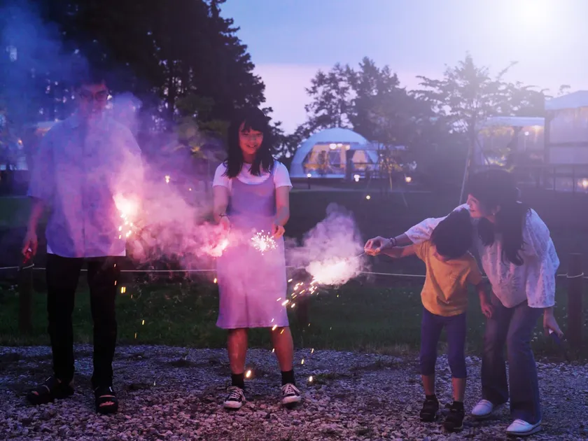 手持ち花火は、夏の夜を彩るアクティビティとして、多くの方に楽しんでいただけます。特に子供たちには大好評です。さらに、毎晩行われるキャンプファイヤーでは、焚き火を囲みながら家族や友人と語らう時間が特別な想い出になります。(手持ち花火は館内販売のみご利用可)