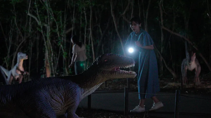 夜の恐竜の森に足を踏み入れると、闇に包まれた木々の間から聞こえる恐竜たちの唸り声や、草むら聞こえる小さな音が来場者の冒険心くすぐります。勇気をもってコースを進み、懐中電灯の灯りを向けた先には恐竜たちが次々と出現。昼間とは異なる夜の闇が、恐竜たちの目の輝きや皮膚の質感を際立たせ、より一層迫力ある姿を感じさせてくれます。