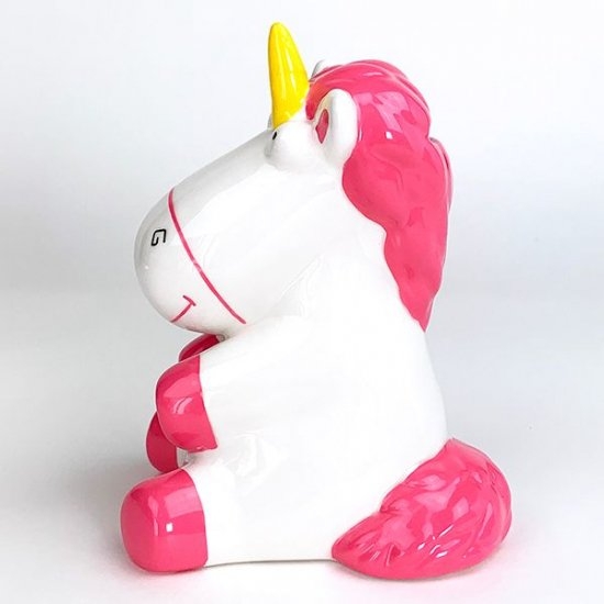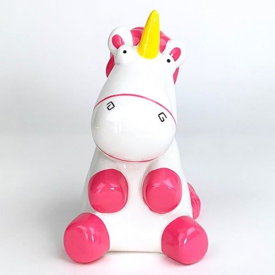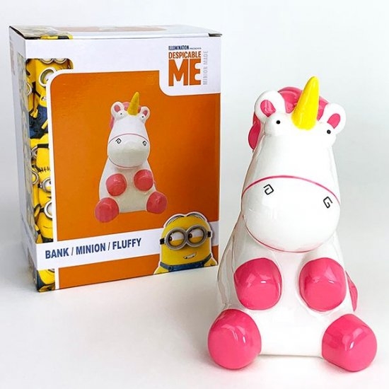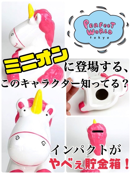 この子の名前知っていますか?ミニオンに登場するピンクのユニコーンです。こにゆるーいお顔が大好きで、某テーマパークでぬいぐるみを購入しようとしたのは私です!そんなゆるーいお顔の貯金箱が素敵ですよ♪