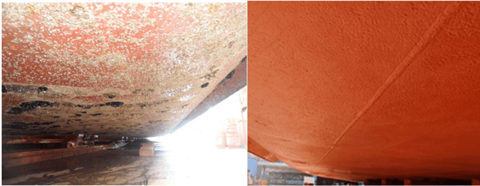右:低摩擦塗料を塗装し約24か月航海した船底