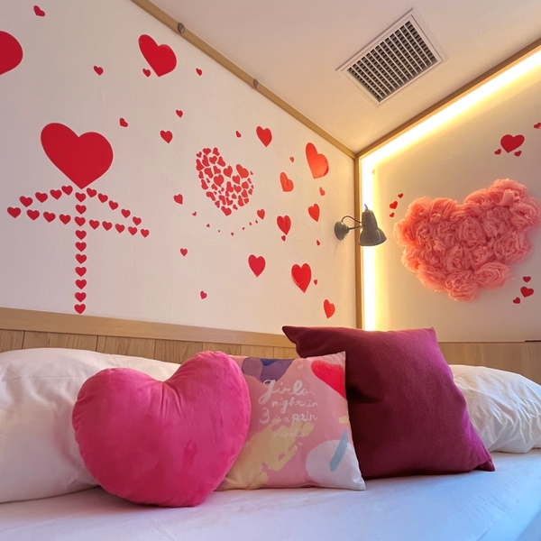 CAFETELの客室は3人部屋がメイン。3人の旅を楽しんでCAFETELに帰ってくると、楽しい夜の始まり!夜な夜なたくさんの女子が繰り広げるであろう話はもちろん恋バナ♡そんな女子たちのために新たなコンセプトルーム、恋バナはずむ「恋ルーム」が登場しました!お部屋は恋バナがより盛り上がる大人かわいいデザイン。部屋に一歩入ると、誰にも邪魔されない私たちだけの秘密の空間が広がります。ハートのクッションを抱いてあの人の話をするのもよし、大好きな推しの話で盛り上がるのもよし!
