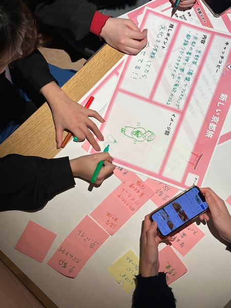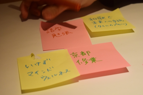 京都の企業 や伝統工芸、大学生やアーティスト、寺社仏閣や旅行関係など様々 な分野から約 50 名が参加。ブレストのテーマのひとつ 「CAFETEL で女子視点の新しい宿泊体験を作るとしたら?」 から生まれた数々のアイディアのなかで採用したのが、女子旅=「恋ルーム」でした。