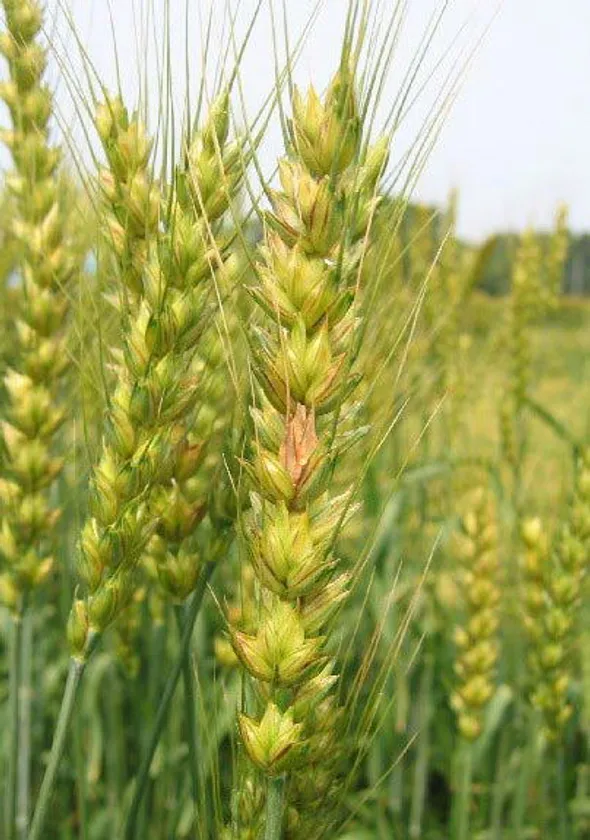 赤かび病は糸状菌(かび)の一種に起因する麦類の重要病害で、主にコムギやオオムギ等の穂に感染します。本病は、麦の出穂期から開花最盛期(大麦は穂揃期)に雨が多く、気温が高く経過すると発生しやすくなります。長野県北信地域の一部の栽培圃場では、すでに初期病斑が確認されています。また、赤かび病菌はかび毒であるデオキシニバレノール(DON)を産生することから、適切な防除対策が必要です。デオキシニバレノール(DON)とは、人畜に対して有害な毒素を発生するかび毒で、摂取すると悪心、嘔吐、下痢、腹痛、頭痛、めまい及び発熱といった急性症状を引き起こすことがあります。