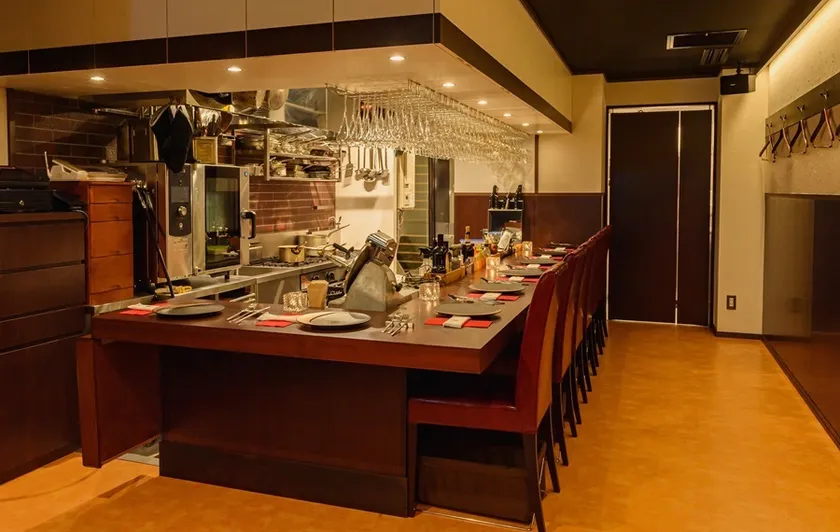 店内は、風合いのある白い漆喰壁と温かい木目を基調にした落ち着いた雰囲気で、ゆったりとした8名のカウンターと6名のテーブル席。圧倒的に人気のカウンター席では、料理歴30年のシェフ蒲生弘明の織りなすライブ感ある皿に目を奪われます。コースは4種類あり、中でも「トリュフとポルチーニ茸のカルボナーラ」と「熊本赤牛のロースト」が入ったコースが一番人気となっています。イタリアンワインを熟知したソムリエでもある蒲生弘明は料理に合わせてワインをセレクトすることはもちろん、ワイン初心者から上級者までそれぞれの好みも掛け算し、お客様側に立った最高のペアリングを提案してくれるとファンが多いです。ボトルワインは105種類以上、珍しいワインや希少な年代物も多数取り揃えていますが、旬の料理に合わせて少しずつグラスワインを楽しみたい方に最適なコースを用意しています。