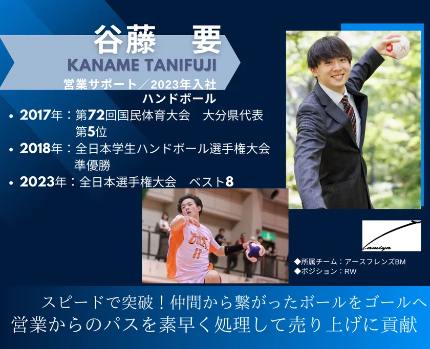 2人の姉の影響で小学1年生から始めたハンドボールで県代表、大学チームで準優勝を経験。地元企業に就職し引退するもハンドボールのない生活に違和感をおぼえ、東京へ。できたばかりのチームを全日本の舞台へ引き上げた。引退後にビジネス界でも求められる存在になりたいと、タミヤホームで営業サポートの経験を積む。社長は面接時から全力応援を宣言し、社員はチームの応援にも来てくれる。「ここで働けることで競技生活に集中できます」と語る。