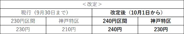 神戸市交通局の運賃改定実施に伴い、同調運賃区間である神戸特区を230円へ変更。